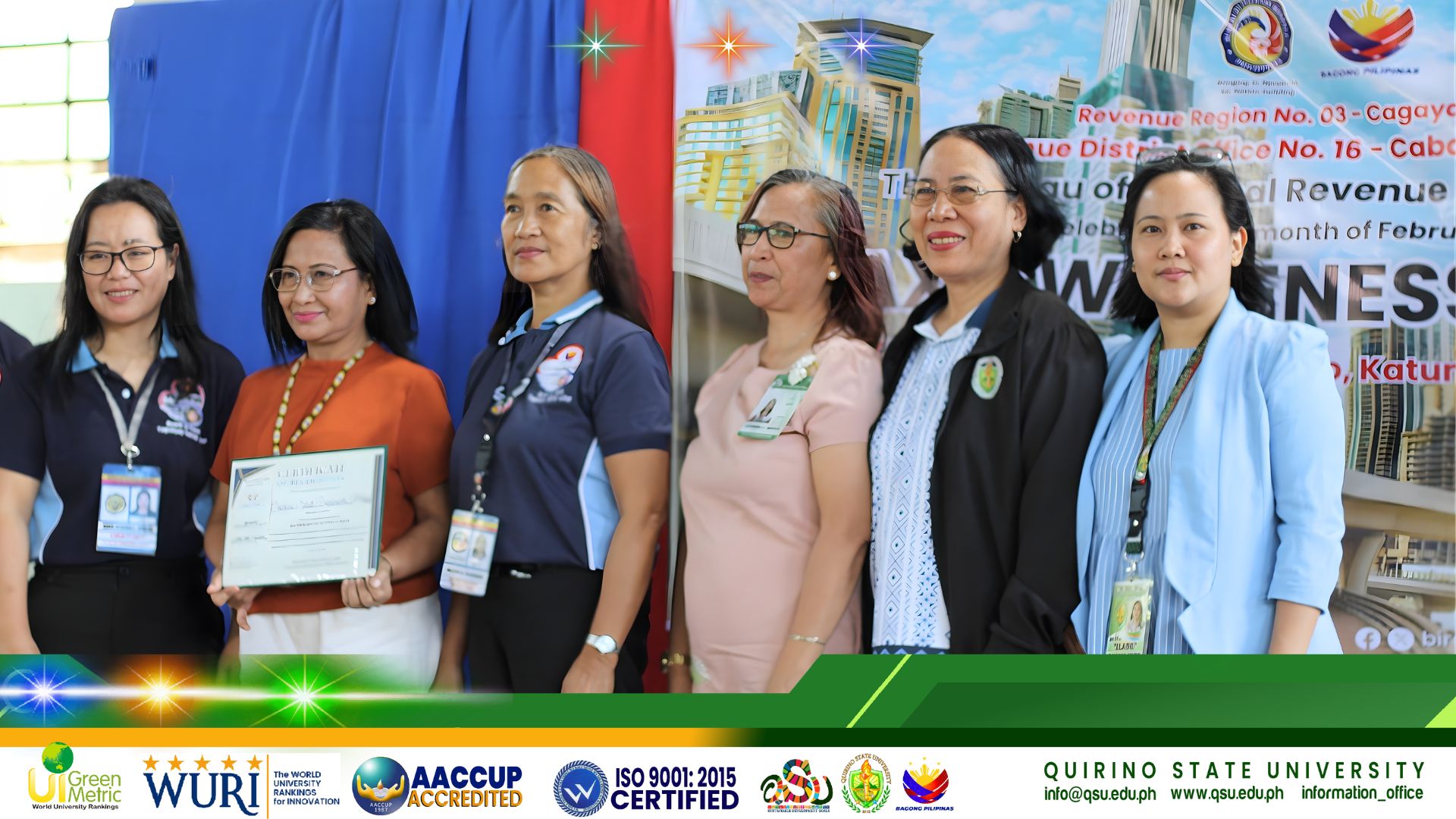 Honoring QSU’s consistent support, the BIR awarded the University with a certificate of recognition for serving as the agency’s valued partner during Taxable Year 2025. Representing Dr. Alfonso R. Simon, OIC-President, the certificate was received by Dr. Florigold V. Saldaen, Vice President for Administration and Finance; Dr. Leila M. Sabbaluca, Supervising Administrative Officer for Finance; and Dr. Elaine May R. Gonzales, Head of the Information Unit.