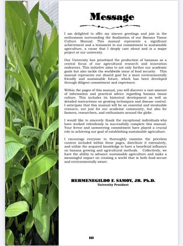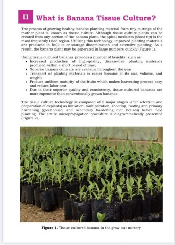 This comprehensive guide serves as a practical reference for farmers, agriculture professionals, and banana growers, focusing on the propagation, management, and commercialization of tissue-cultured banana varieties. Developed by a multidisciplinary team of experts from the University, the manual consolidates years of research, field experience, and local best practices into an accessible resource aimed at enhancing productivity and sustainability in the banana industry.